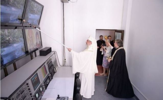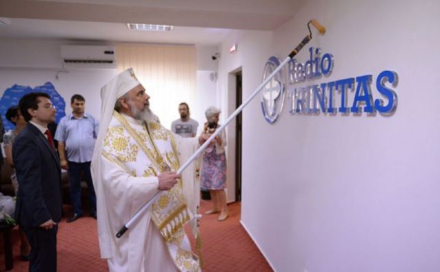 Ο Πατριάρχης Δανιήλ είχε βουτήξει νωρίτερα τη βούρτσα σε αγιασμένο λάδι το ρολό με το οποίο πέρασε τις εγκαταστάσεις των γραφείων τηλεοπτικού στούντιο στο Βουκουρέστι.